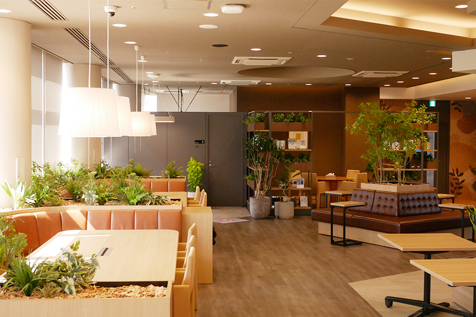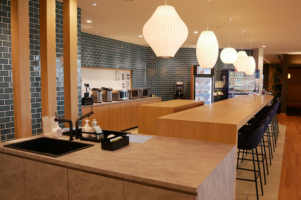 最新のコーヒーメーカーや給茶機、冷凍食品のスマート販売機や電子レンジが設置されているエリアになります。小腹がすいたときや、ランチタイムに多く利用されています。