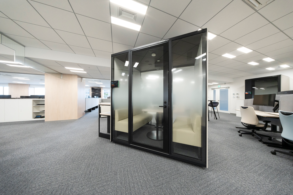 遮音・防音に優れた個室となっており、主にリモート会議やウェビナーを気兼ねなく行うことができます。使用予約は社内システムでできるほか、タブレットから直接予約することもできます。
