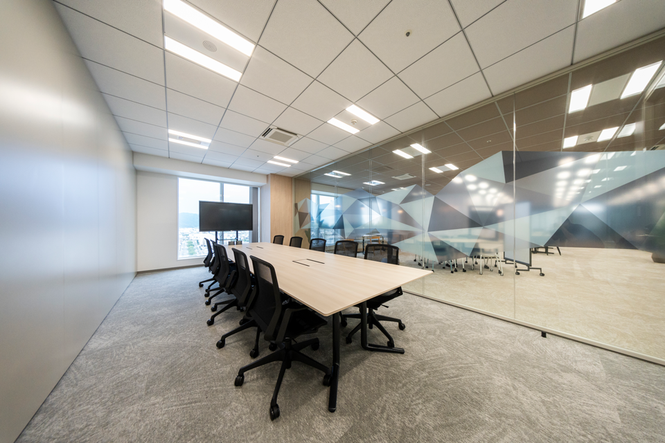 ガラス張りですっきりとした印象の会議室です。多くの会議はこちらで行われています。